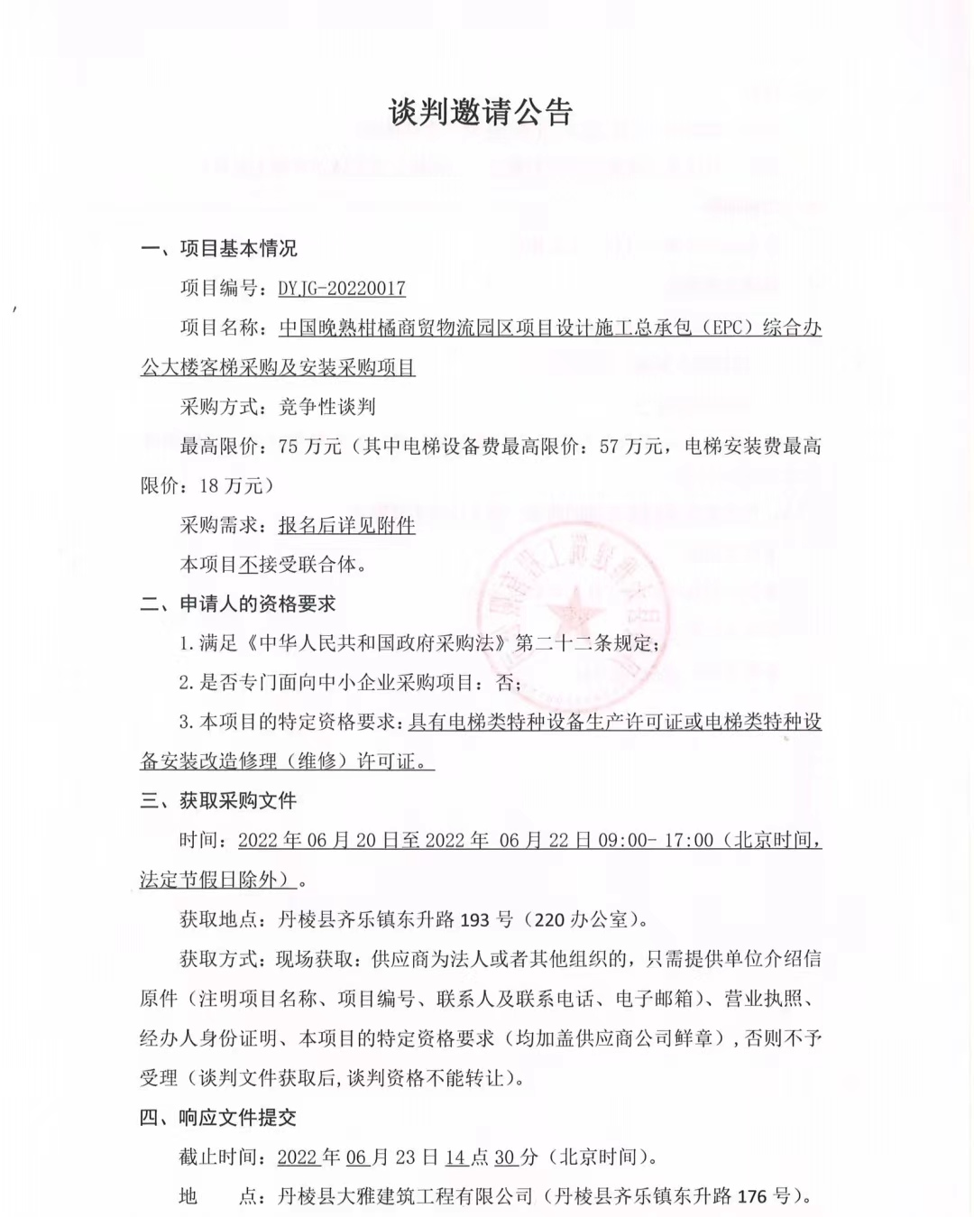 中國晚熟柑橘商貿(mào)物流園區(qū)項(xiàng)目設(shè)計施工總承包(EPC)綜合辦公大樓客梯采購及安裝采購項(xiàng)目談判邀請公告