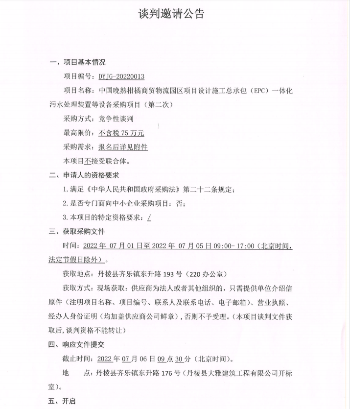 中國晚熟柑橘商貿物流園區(qū)項目設計施工總承包(EPC)一體化污水處理裝置等設備采購項目第二次談判邀請公告