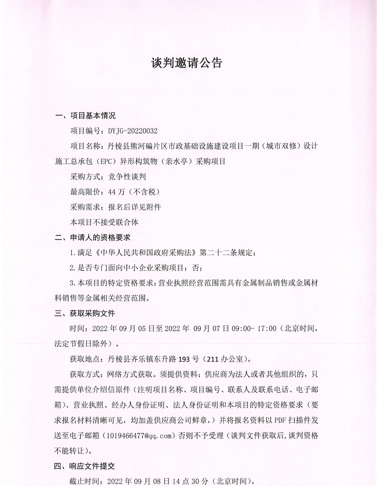丹棱縣熊河碥片區(qū)市政基礎設施建設項目一期(城市雙修)設計施工總承包(EPC)異形構筑物(親水亭)采購項目談判邀請公告