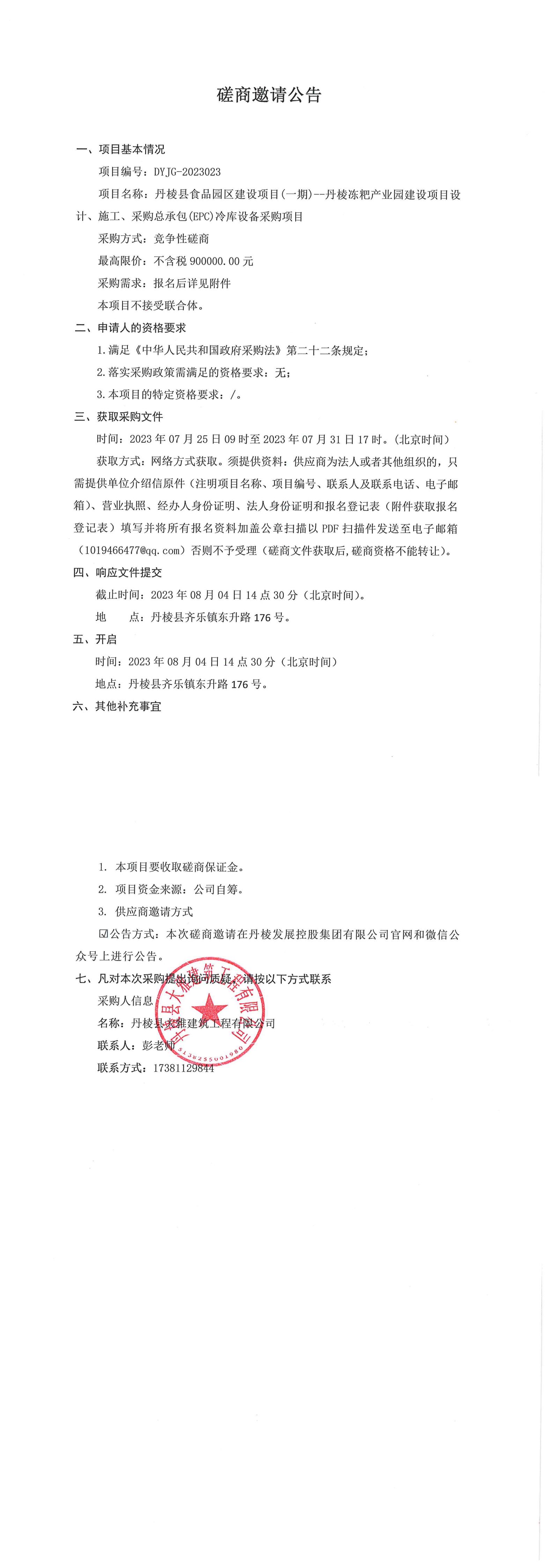 丹棱縣食品園區(qū)建設(shè)項(xiàng)目(一期)--丹棱凍粑產(chǎn)業(yè)園建設(shè)項(xiàng)目設(shè)計(jì)、施工、采購總承包(EPC)冷庫設(shè)備采購項(xiàng)目磋商邀請公告