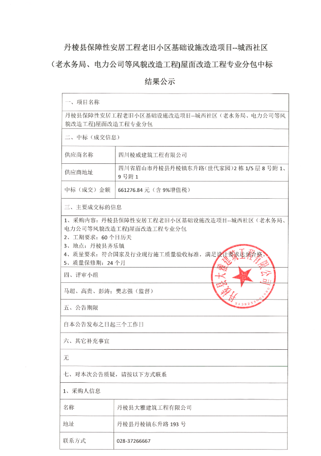 【大雅建筑公司】丹棱縣保障性安居工程老舊小區(qū)基礎(chǔ)設(shè)施改造項目--城西社區(qū)(老水務(wù)局、電力公司等風(fēng)貌改造工程)屋面改造工程專業(yè)分包中標(biāo)結(jié)果公示