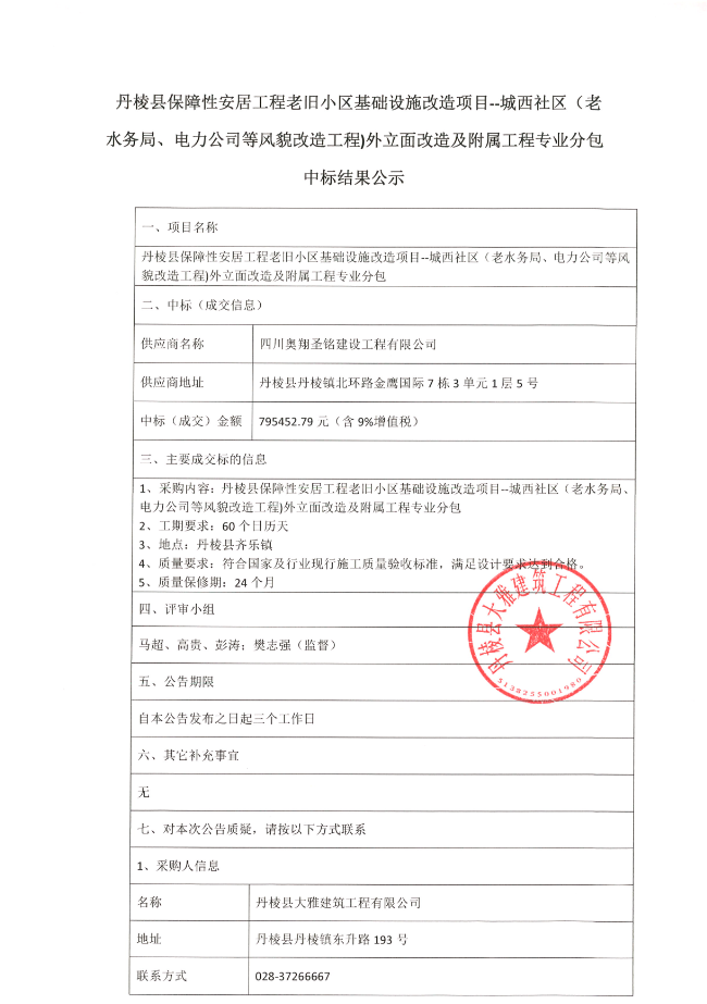 【大雅建筑公司】丹棱縣保障性安居工程老舊小區(qū)基礎(chǔ)設(shè)施改造項(xiàng)目--城西社區(qū)(老水務(wù)局、電力公司等風(fēng)貌改造工程)外立面改造及附屬工程專(zhuān)業(yè)分包中標(biāo)結(jié)果公示