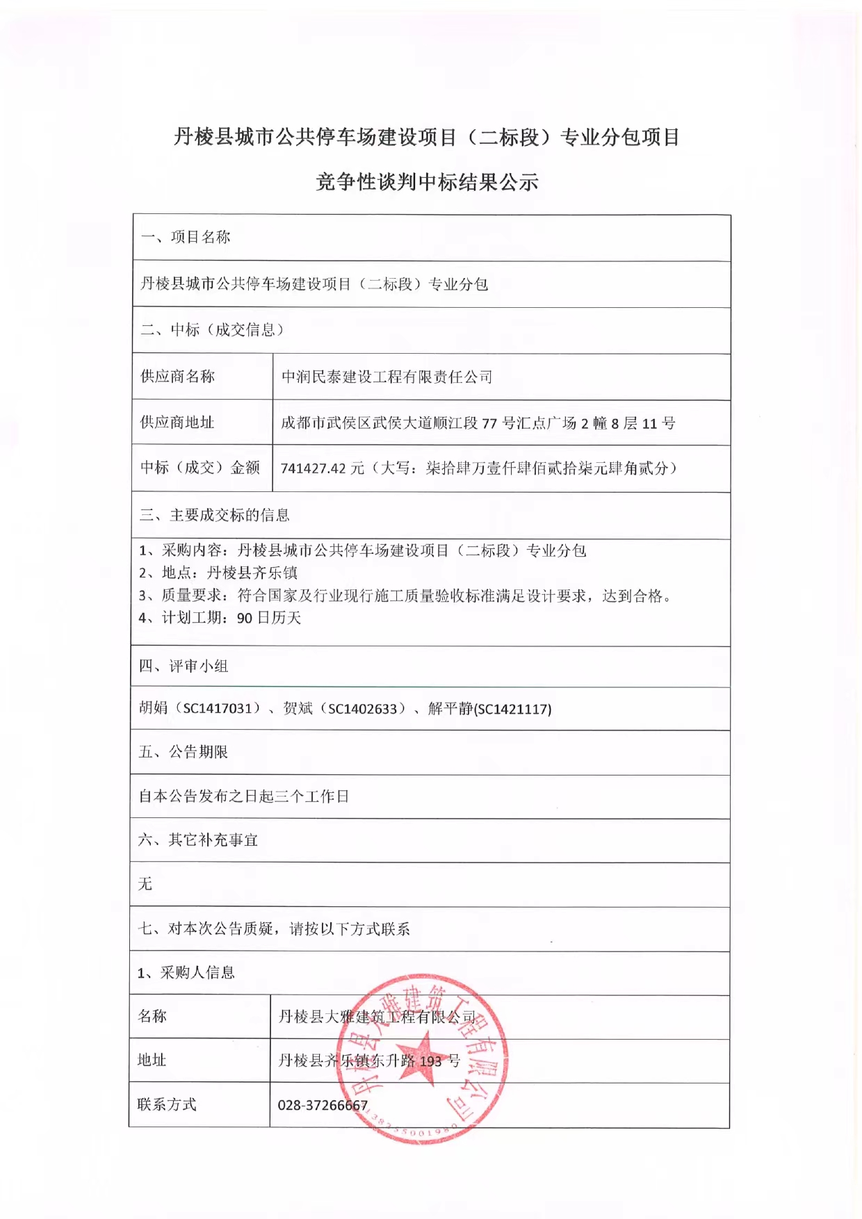 丹棱縣城市公共停車(chē)場(chǎng)建設(shè)項(xiàng)目(二標(biāo)段)專(zhuān)業(yè)分包項(xiàng)目競(jìng)爭(zhēng)性談判中標(biāo)結(jié)果公示
