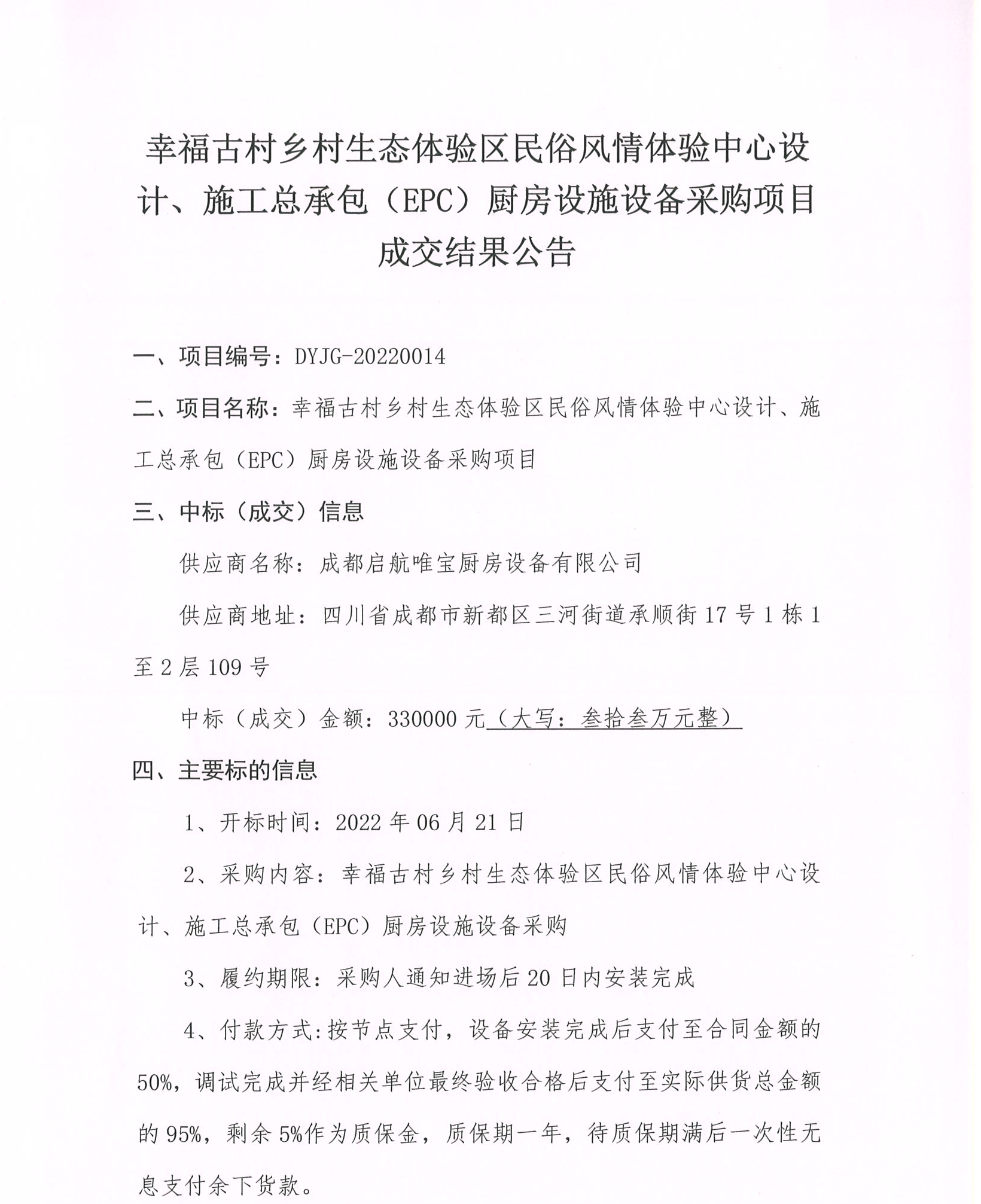 幸福古村鄉(xiāng)村生態(tài)體驗區(qū)民俗風情體驗中心設(shè)計、施工總承包(EPC)廚房設(shè)施設(shè)備采購項目成交結(jié)果公告
