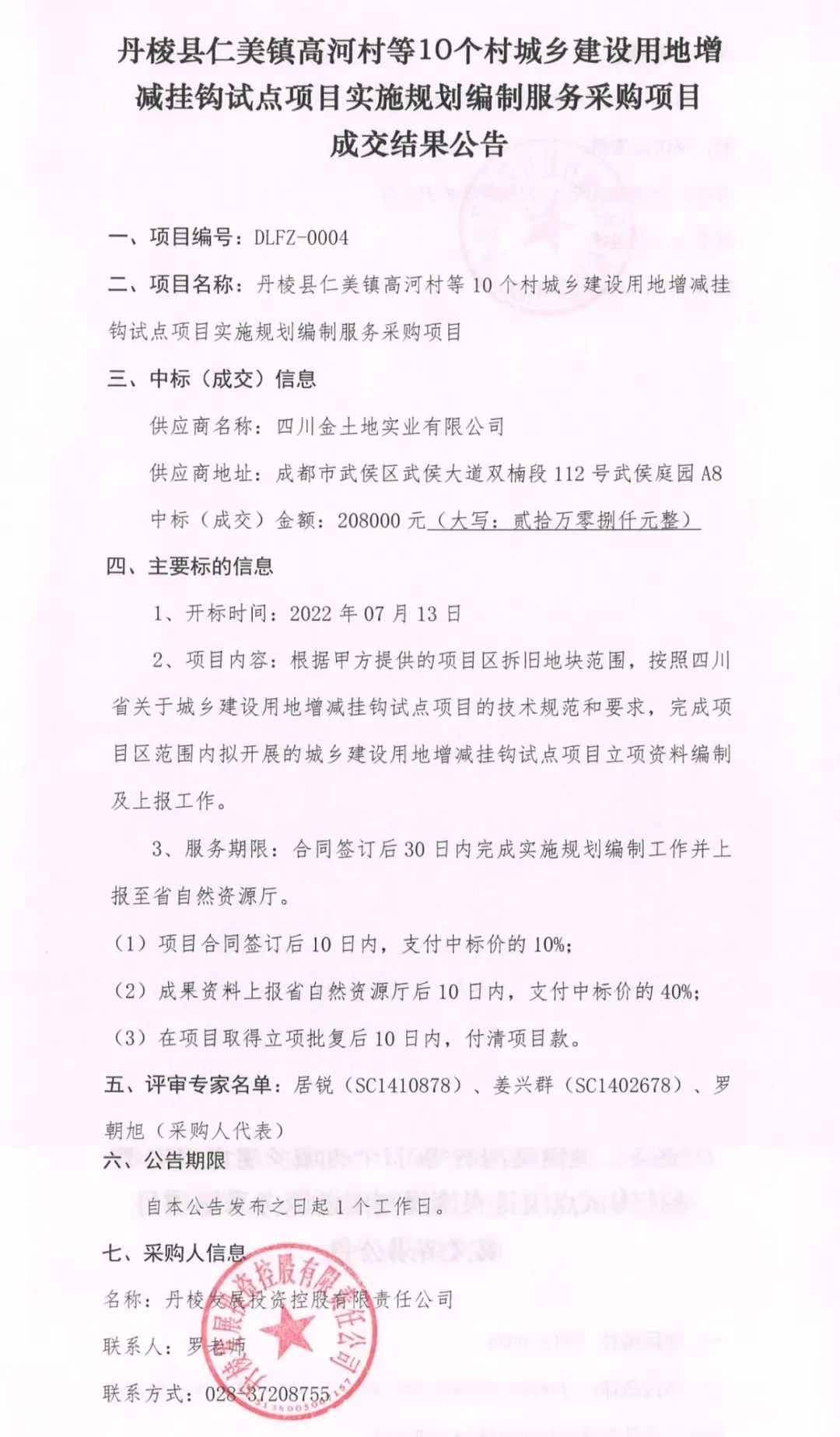 丹棱縣仁美鎮(zhèn)高河村等10個(gè)村城鄉(xiāng)建設(shè)用地增減掛鉤試點(diǎn)項(xiàng)目實(shí)施規(guī)劃編制服務(wù)采購項(xiàng)目成交結(jié)果公告