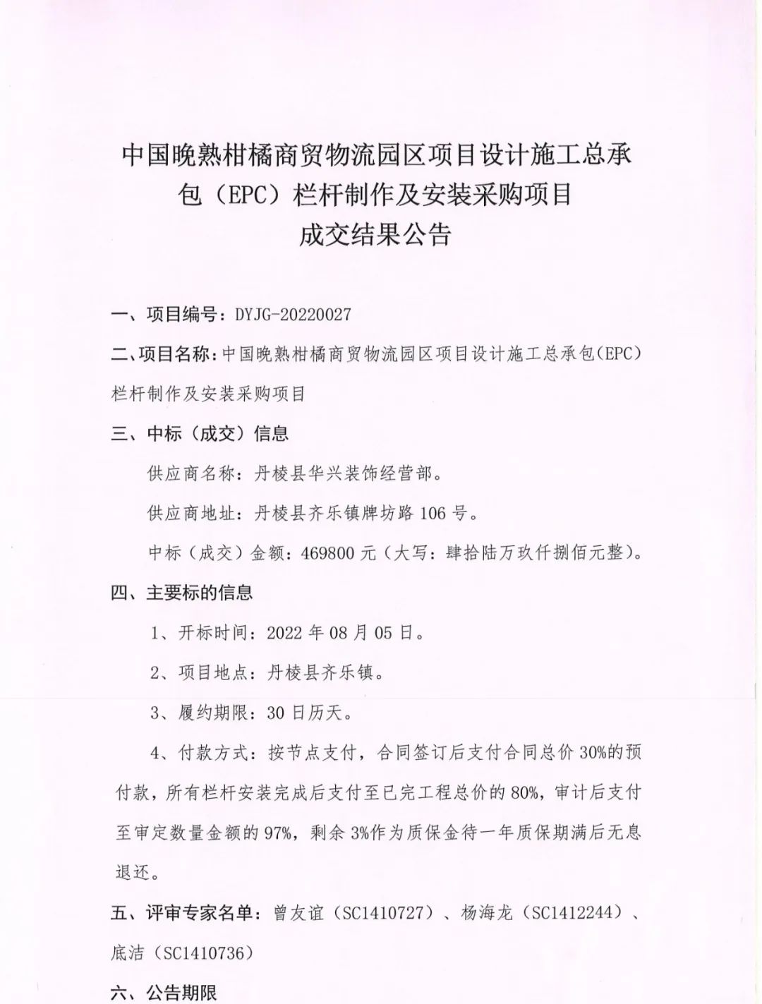 中國晚熟柑橘商貿(mào)物流園區(qū)項目設(shè)計施工總承包(EPC)欄桿制作及安裝采購項目成交結(jié)果公告
