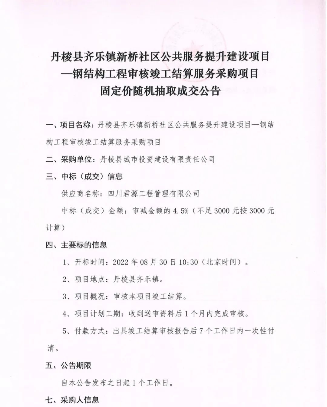 丹棱縣齊樂鎮(zhèn)新橋社區(qū)公共服務提升建設項目--鋼結(jié)構(gòu)工程審核竣工結(jié)算服務采購項目固定價隨機抽取成交公告