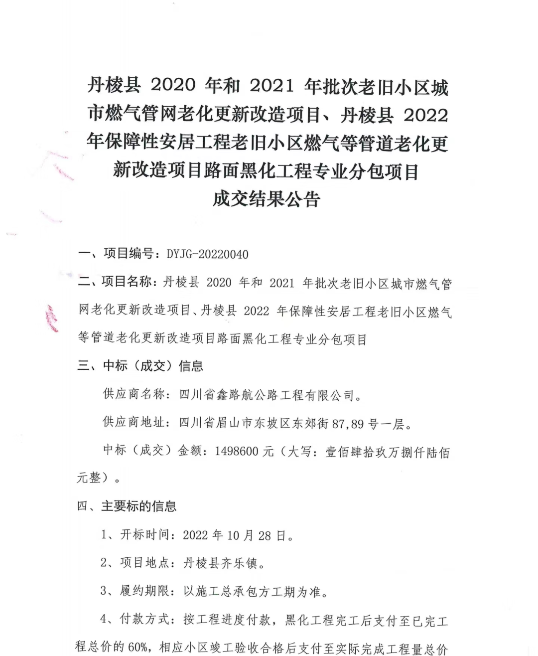 丹棱縣2020年、2021年、2022年保障性安居工程老舊小區(qū)燃?xì)獾裙艿览匣赂脑祉?xiàng)目路面黑化工程專業(yè)分包項(xiàng)目成交結(jié)果公告