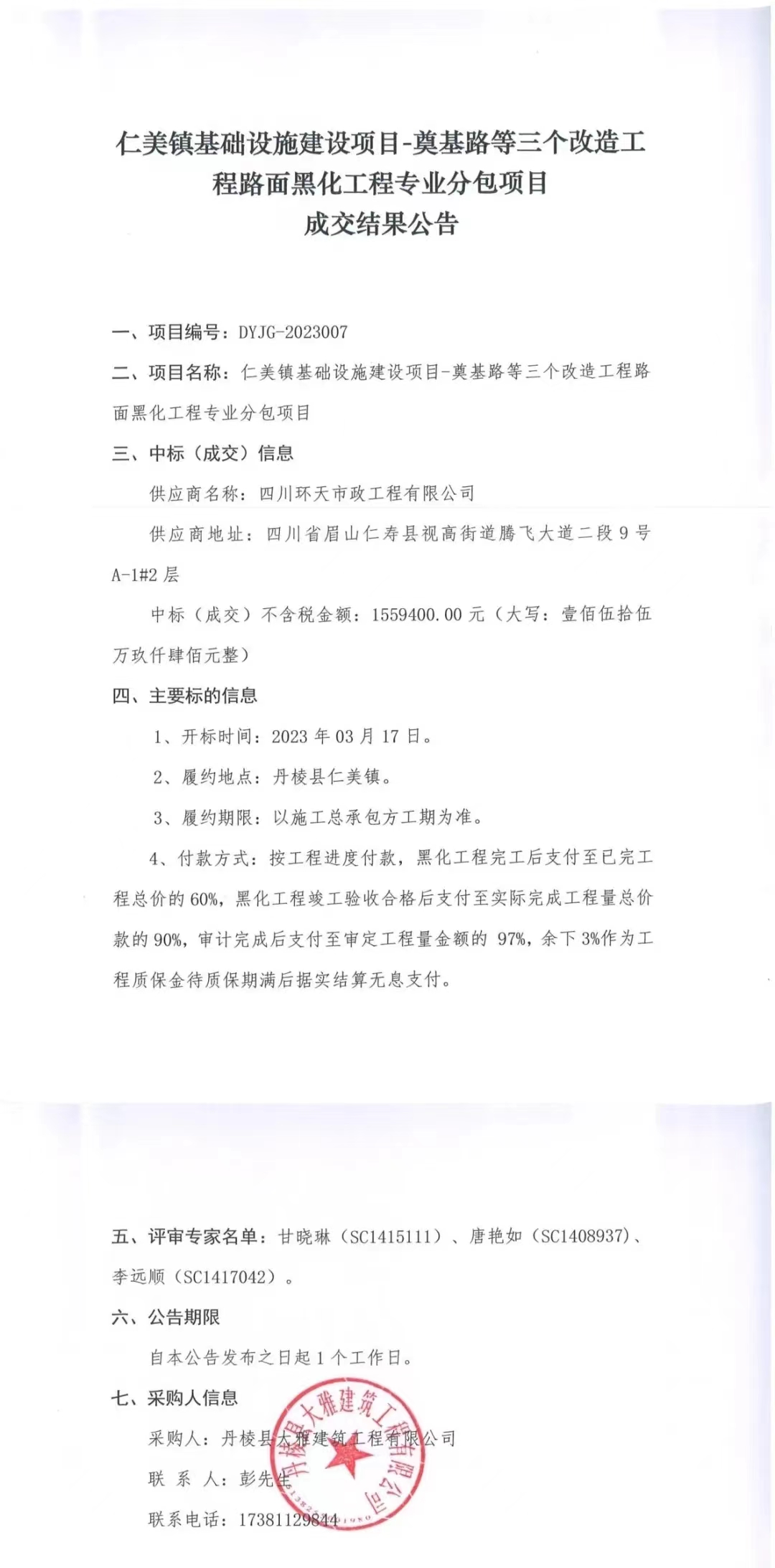 仁美鎮(zhèn)基礎(chǔ)設(shè)施建設(shè)項(xiàng)目-奠基路等三個(gè)改造工程路面黑化工程專業(yè)分包項(xiàng)目成交結(jié)果公告