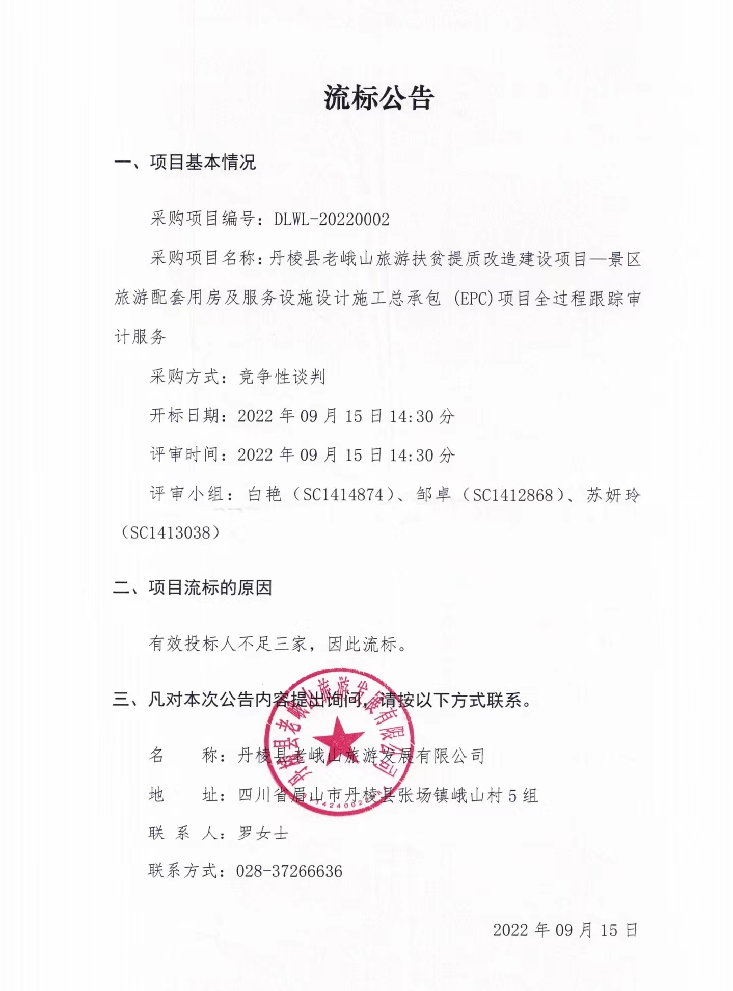 丹棱縣老峨山旅游扶貧提質(zhì)改造建設(shè)項目--景區(qū)旅游配套用房及服務(wù)設(shè)施設(shè)計施工總承包(EPC)項目全過程跟蹤審計服務(wù)流標公告