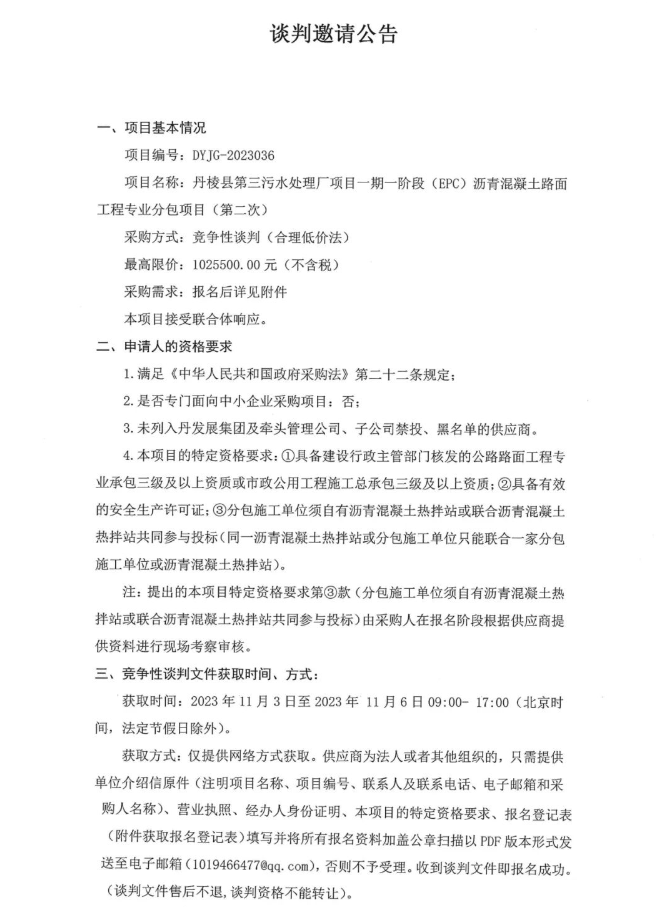 丹棱縣第三污水處理廠項(xiàng)目一期一階段(EPC)瀝青混凝土路面工程專業(yè)分包項(xiàng)目(第二次)談判邀請(qǐng)公告