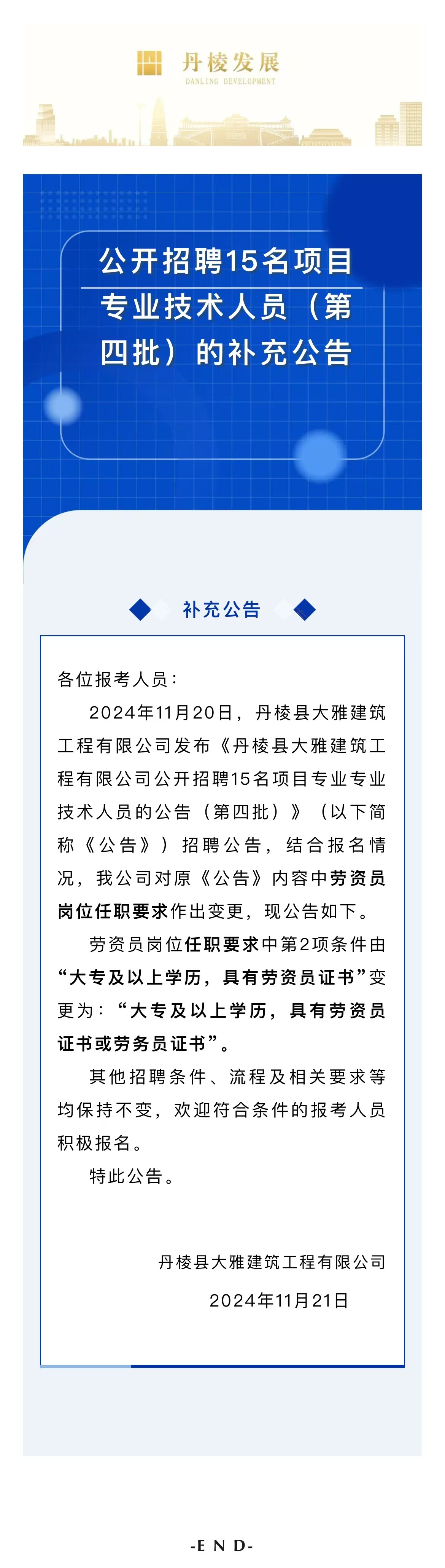 丹棱縣大雅建筑工程有限公司關(guān)于公開招聘15名項(xiàng)目專業(yè)技術(shù)人員(第四批)的補(bǔ)充公告