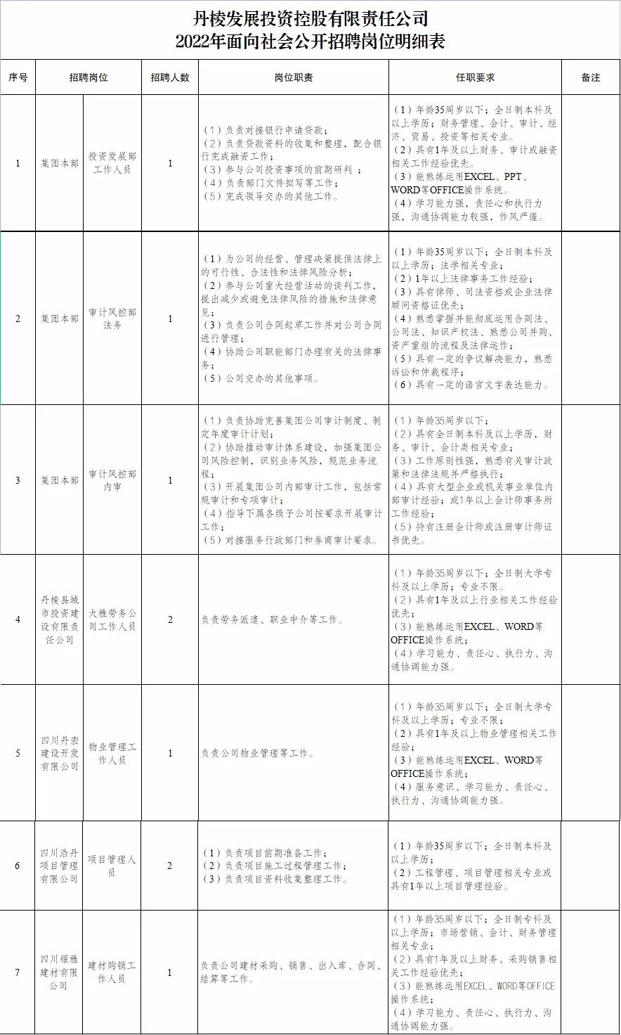 招聘崗位的學(xué)歷、專業(yè)、資歷、年齡等資格條件詳見(jiàn)附件《丹棱發(fā)展投資控股有限責(zé)任公司2022年面向社會(huì)公開(kāi)招聘崗位明細(xì)表》。